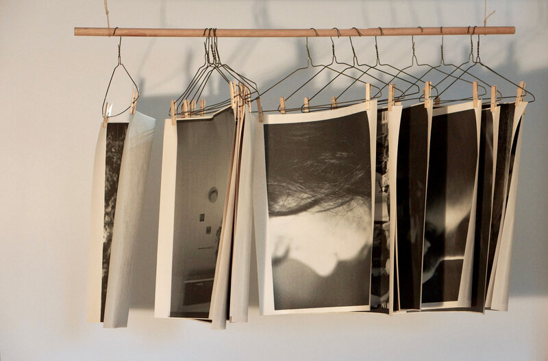 Réactivation d’archives argentiques (montage). Impressions au jet d’encre sur papier newsprint, cintres, épingles à linge, tringle